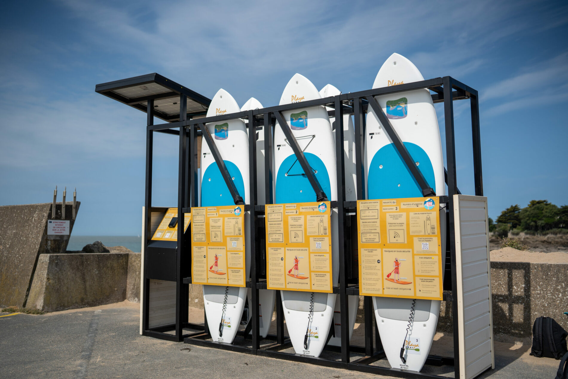 La première station est conçue avec les planches à la verticale. Ce choix de conception permet de voir les planches de loin afin de venir sans réservation pour louer le matériel.
