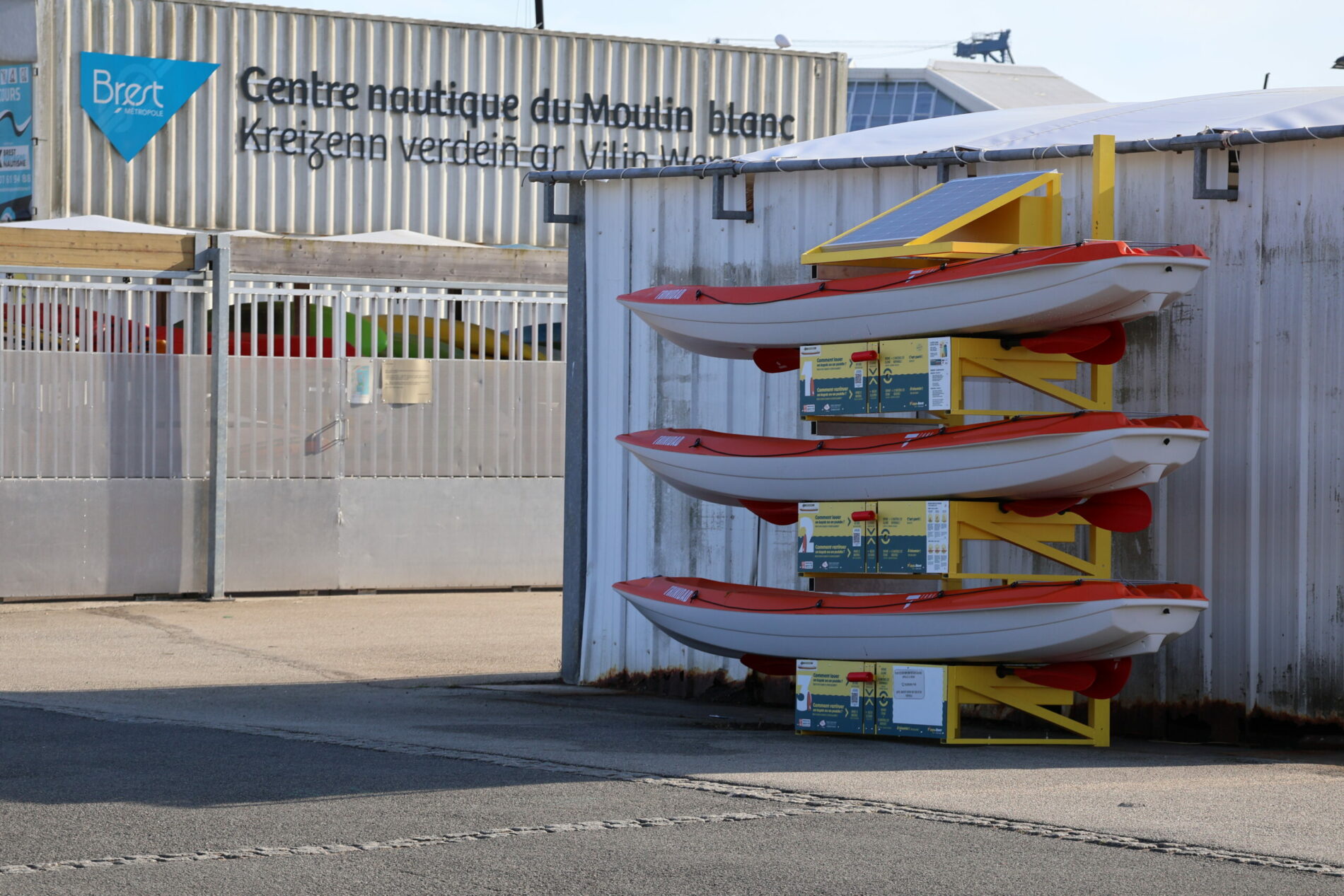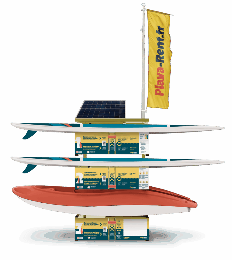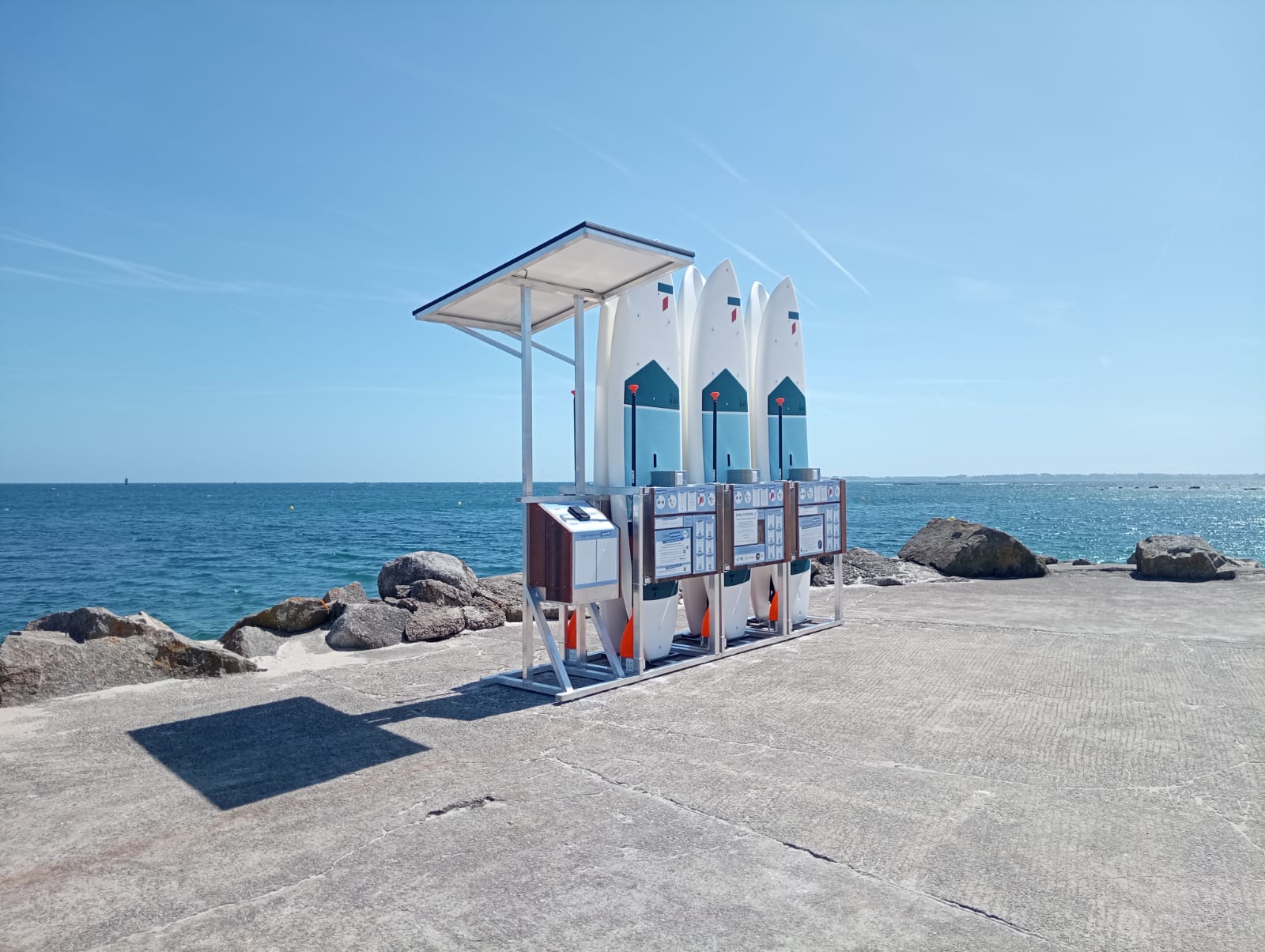 La première station est conçue avec les planches à la verticale. Ce choix de conception permet de voir les planches de loin afin de venir sans réservation pour louer le matériel.
